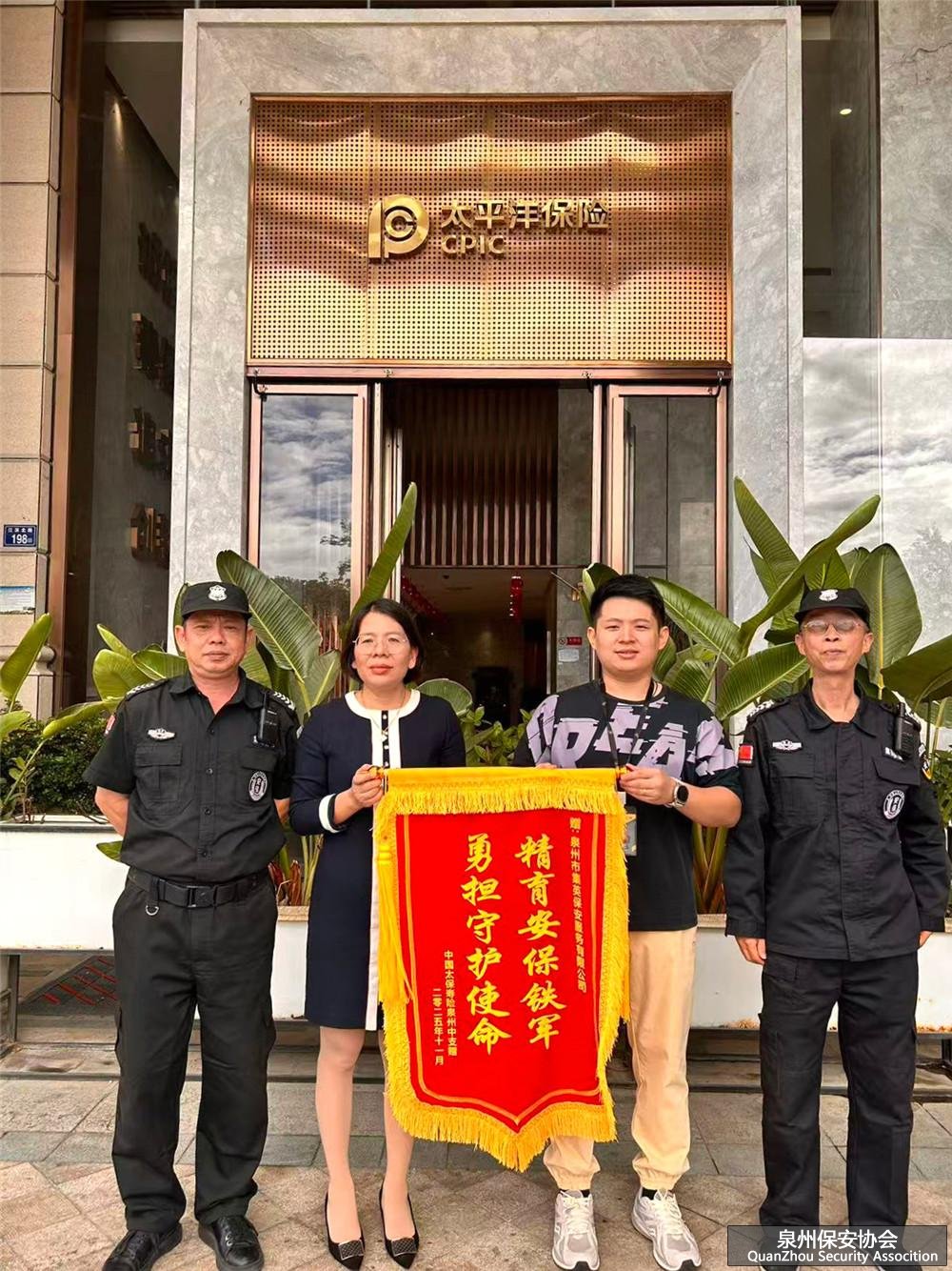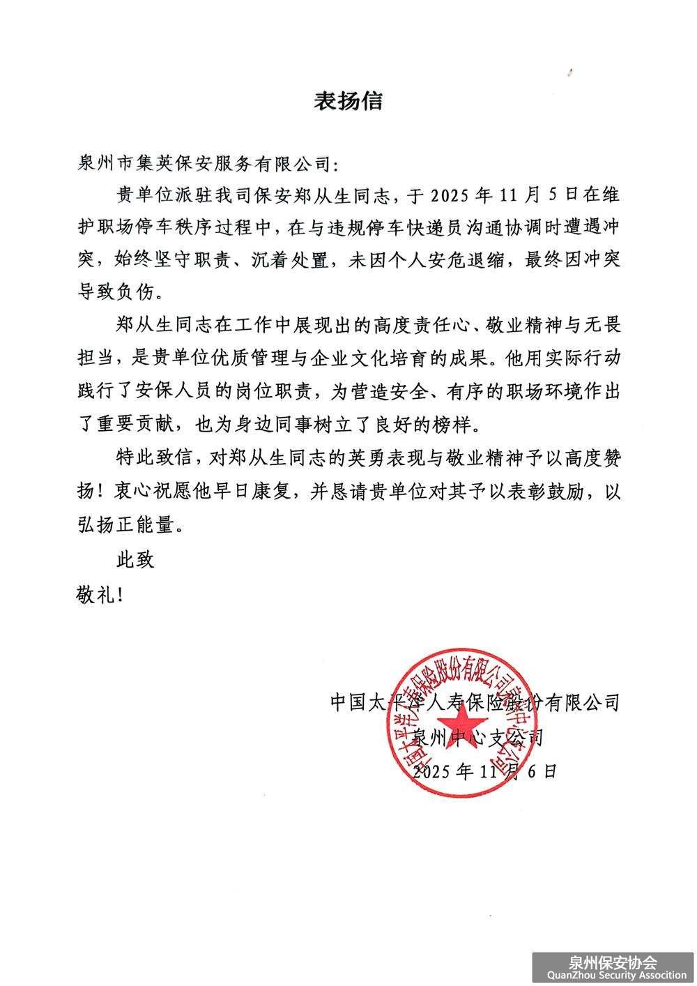 近日,集英集团权属集英保安公司收到一份沉甸甸的“暖心肯定”,客户单位中国太平洋人寿保险泉州中心支公司送来表扬信与锦旗,向驻点保安员郑从生的履职担当致以高度赞誉。