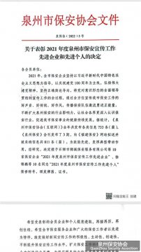 2022年5月,泉州市保安协会对2021年度泉州市保安宣传工作先进企业和先进个人进行了通报表彰,泉州洛江群英保安服务有限公司获得泉州市保安宣传工作先进企业与泉州市保安宣传工作先进个人荣誉表彰。 回顾2021年度公司保安宣传工作,泉州市洛江群英保安服务有限公司领导...