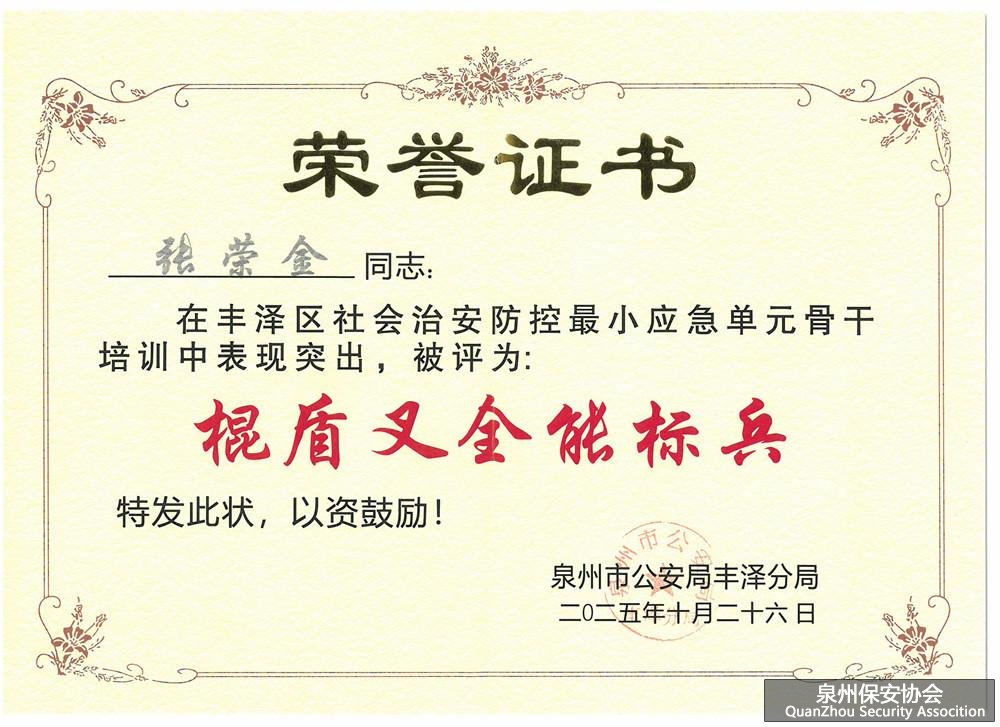 在泉州市公安局丰泽分局组织开展丰泽区社会治安防控最小应急单元骨干培训中,福建省海丝保安服务有限公司选派的队员张荣金同志积极参训,凭借扎实的技能功底与出色的综合表现,被授予 “棍盾全能标兵”荣誉称号,为公司赢得荣誉。