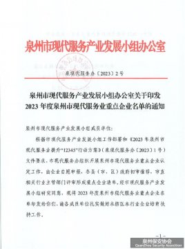 日前,2023年度泉州市现代服务业重点企业名单正式出炉,首批75家泉企上榜,涉及现代物流、批发零售、住宿餐饮、商务服务、工业设计、电子商务、文化旅游、金融服务、科技服务、数字服务、家政服务、人力资源服务、安保服务、健康服务、综合类等15个领域。福建省晋江市...