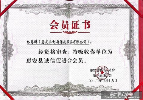 近日,惠安剑盾保安公司被县诚信促进会吸纳为会员单位。惠安剑盾公司自成立以来在企业经营活动中自觉树立诚信经营理念,健全诚信经营制度,规范诚信经营行为,严格履行对客户单位的合同承诺,努力为客户提供优质、安全、可靠的服务,赢得了广大客户的充分信赖和认可,...