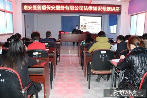 为强化员工的法律意识,提高员工对涉法纠纷依法处理的能力,3月30日下午,惠安剑盾保安公司邀请公司法律顾问开展了一场别开生面的法律知识专题讲座。讲座在公司四楼会议室举行,全体服务岗人员参加,公司党支部书记、总经理陈杰主持。 此次讲座采取了现场授课与答疑互...