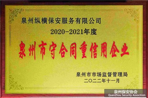 近日,泉州纵横保安公司收到了泉州市市场监督管理局颁发的守合同 重信用企业奖牌和证书,包括2016-2017年度、2018-2019年度、2020―2021年度,泉州纵横保安公司已连续六年荣获泉州市守合同 重信用企业称号。 泉州纵横保安公司自2012年成立以来,高度重视信用管理工作,...