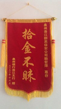 2020年12月25日上午,泉州银行洛江支行办公室王主任将一面拾金不昧锦旗送到公司,对泉州洛江群英保安公司派驻泉州银行网点保安员赖哲萍表达感谢之情。 时间倒回到2020年11月2日晚上9时,保安员赖哲萍像往常一样在公司派驻泉州银行洛江网点巡逻,突然发现自动...