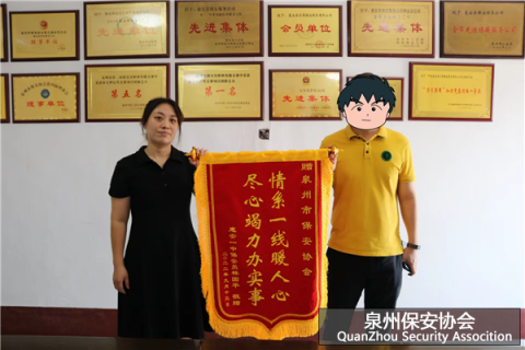 9月13日上午,一面赠予泉州市保安协会的锦旗被送到惠安剑盾保安公司,锦旗上写着尽心竭力办实事情系一线暖人心,是剑盾公司驻惠安一中保安员林国平为感谢泉州市保安协会的帮扶,特地送到剑盾公司并恳请公司代为转交至市保协。 林国平于今年7月突发疾病住院冶疗花费大额...