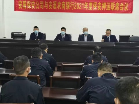 2021年12月20日晚,福建省安盾保安服务有限公司与福建安溪农村商业银行联合在安盾保安公司举行保安押运联席会议。安盾保安公司副总经理许世旭和安溪农商银行保卫部总经理李永强共同出席会议。驻安溪农村商业银行车组的押运员全部参加会议。 会上,宾主双方分...