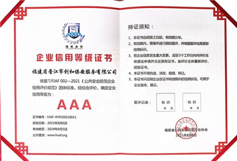 2021年10月14日,晋江市创和保安服务有限公司收到福建省公共安全防范行业协会颁发的AAA企业信用等级证书。 据悉,2020年10月29日,福建省公共安全防范行业协会发布了关于团体标准的公告:根据《中华人民共和国标准化法》及《福建省公共安全防范行业协会标准...
