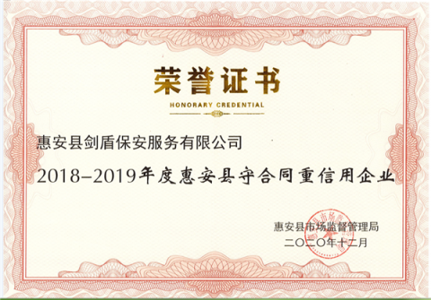 近日,惠安县剑盾保安服务有限公司获评惠安县20182019年守合同 重信用企业。 守合同、重信用是惠安县市场监督管理局组织的一项高规格企业评选,以表彰企业在合同制度管理、合约履行能力以及企业社会信誉等方面所取得的成绩。获得评定和公示的皆是各行业中诚...
