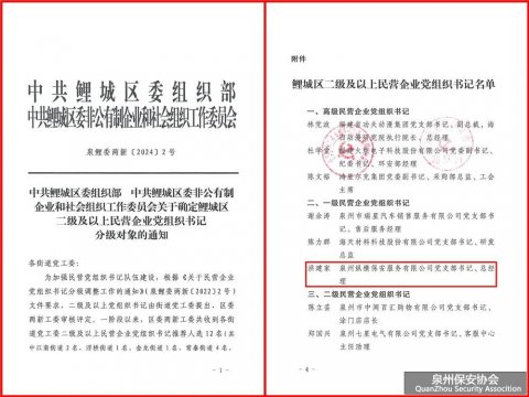 近日,中共鲤城区委组织部与中共鲤城区委非公有制企业和社会组织工作委员会联合发布了《关于确定鲤城区二级及以上民营企业党组织书记分级对象的通知》,泉州纵横保安服务有限公司党支部书记、总经理洪建家同志,被正式认定为鲤城区一级民营企业党组织书记。 自泉州纵横...