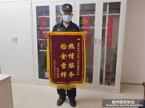 感谢拾金不昧的保安员,当天我都已经快到动车站了,接到电话才知道手袋丢了。近日。福建省海丝保安服务有限公司收到了一通表扬电话和锦旗,被表扬的对象是公司驻东海而语言保安员袁荣万,他在执勤中捡到一个手提袋,两个小时候快速找到失主完璧归赵,帮助失主挽回损失...