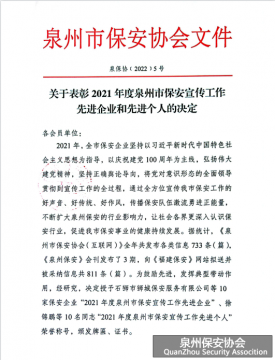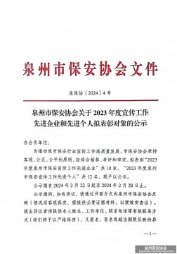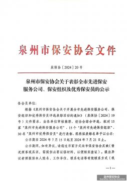 根据《福建省保安组织和保安人员表彰奖励暂行规定》和《泉州市公安局关于评选全市先进保安服务公司、保安组织、优秀保安员的通知》要求,全市各地认真开展了评选工作,通过各地推荐,经市公安局审核,共产生了10家先进保安服务公司、30个先进保安组织及56名优秀保安员...