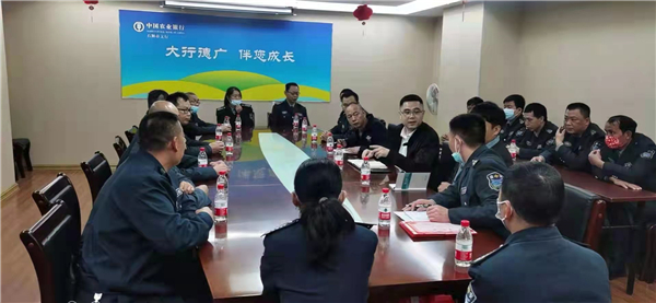 期间,林副行长先介绍了上一年度保安队员整体履职情况和取得的工作成效,对其积极工作的态度给予了充分肯定,随后提出三点工作要求:一、提高保安工作思想认识,全面落实各项工作制度。二、紧绷疫情防控这根弦,就地过年出省报备。三、做好消防检查,及时消除潜在的安全隐患。最后,蔡大队作了三点强调:一是做好春节值守工作。值班人员要严格落实值班纪律规定,贯彻落实银行疫情防控要求,如遇特殊情况及时上报,同时保持行为举止端正、着装整齐、文明用语。二是落实春节放假规定。轮休人员要谨遵“少流动,不聚集,不聚餐”的防疫要求,落实请销假制度,出行严格遵守交通规则,坚决做到喝酒不开车,开车不喝酒。三是做好节后收心工作。春节假期结束后,保安中队长要带头做好收心工作,带领每个保安员积极投入岗位,助力安全生产。