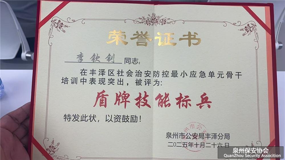 10月26日,泉州市公安局丰泽分局组织开展丰泽区社会治安防控最小应急单元骨干培训,旨在强化基层应急力量实战能力,筑牢辖区安全防线。我司选派优秀员工李钦钊参训,其凭借扎实的技能功底、刻苦的训练态度及出色的实战表现,被评为“盾牌技能标兵”,为公司赢得荣誉。